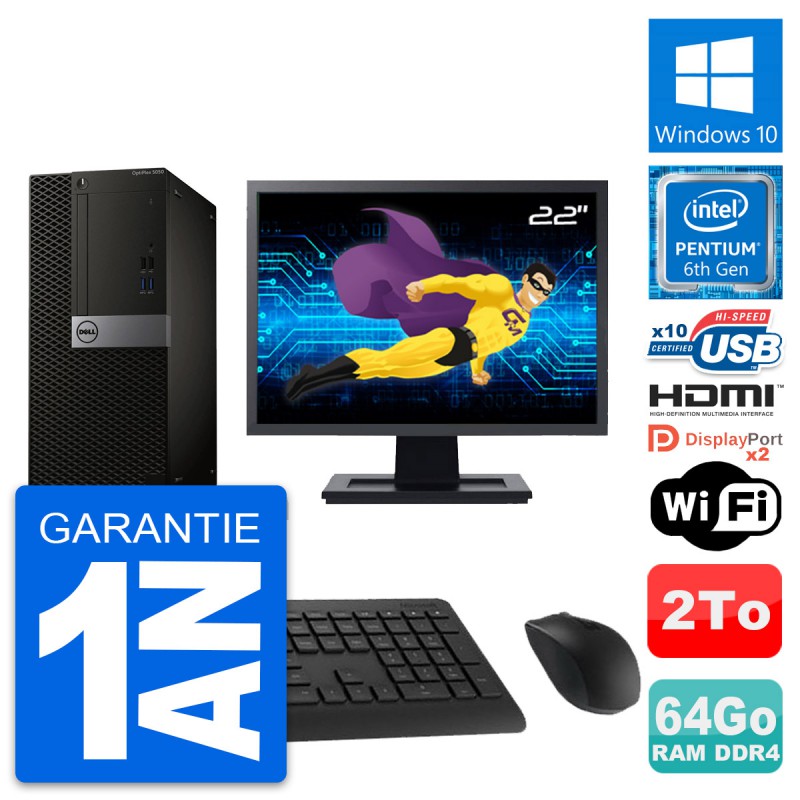 PC Tour Dell OptiPlex 5050 MT - Intel Pentium Dual-Core G4400 3.3 Ghz (3 Mo) - 64 Go DDR4 - Disque Dur 3,5" 2 To - Clef Wifi USB - Windows 10 - Livré avec Ecran 22" + clavier + souris (Marques et modèles variables) - Garantie 1 an.