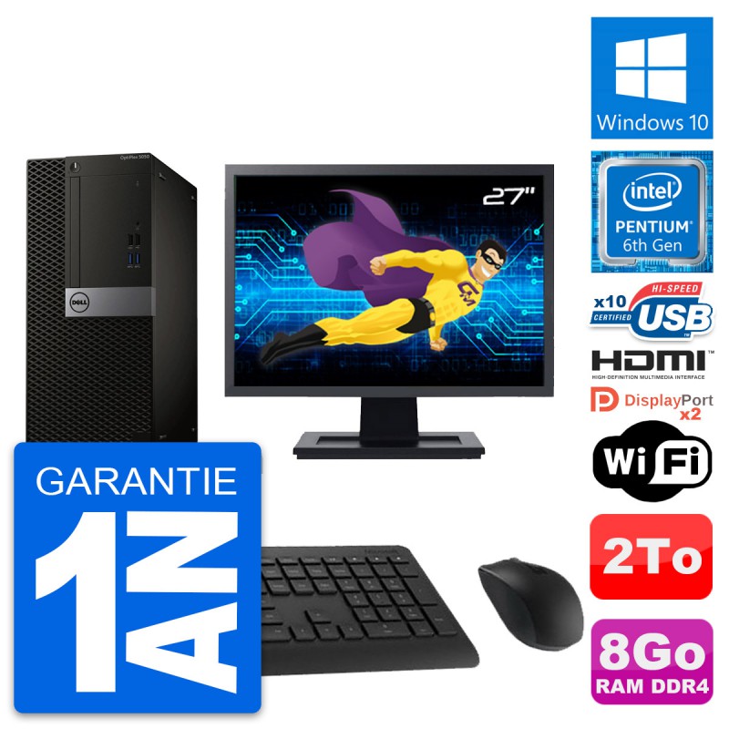 PC Tour Dell OptiPlex 5050 MT - Intel Pentium Dual-Core G4400 3.3 Ghz (3 Mo) - 8 Go DDR4 - Disque Dur 3,5" 2 To - Clef Wifi USB - Windows 10 - Livré avec Ecran 27" + clavier + souris (Marques et modèles variables) - Garantie 1 an.