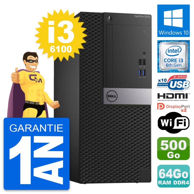 PC Tour Dell OptiPlex 5050 MT i3-6100 RAM 64Go Disque 500Go HDMI Windows 10 Wifi